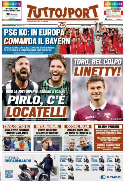 "Pirlo, c'è Locatelli. Bel colpo Toro, Linetty" si legge in prima pagina sull'edizione odierna di Tuttosport. Mercato in primo piano col regista del Sassuolo che piace a Pirlo. In alto si parla della vittoria della Coppa dei Campioni per il Bayern, in basso le ultime su Ibra-Milan e sull'Inter.