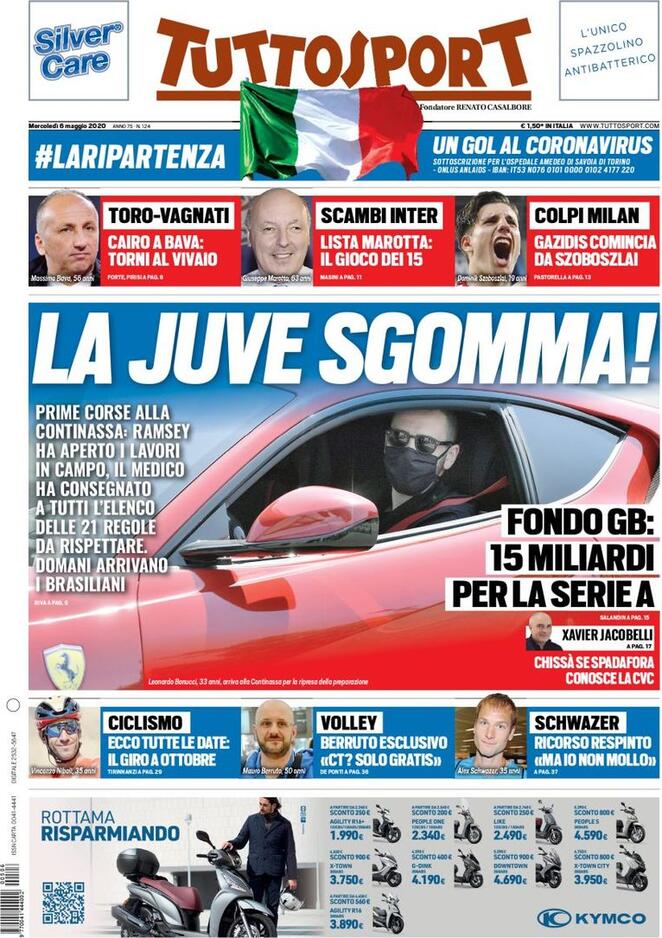 L'edizione di oggi di Tuttosport apre con la Juventus e la ripresa degli allenamenti: per i bianconeri sono ricominciati i lavori alla Continassa con Ramsey che ha di fatto aperto le danze. Spazio poi al mercato con Szoboszalai finito nell'orbita del Milan di Gazidis.
