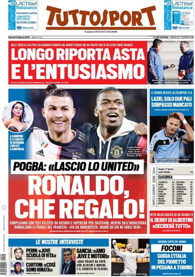 "Ronaldo, che regalo. Lazio, solo due pali" sono tra i titoli principali del quotidiano Tuttosport oggi in edicola, che si divide tra i 35 anni del campione portoghese e lo zero a zero della Lazio contro il Verona che vuol dire sorpasso mancato all'Inter. In alto spazio al Torino con il ritrovato entusiasmo dopo l'arrivo in panchina di Longo che ha sostituito Mazzarri.
