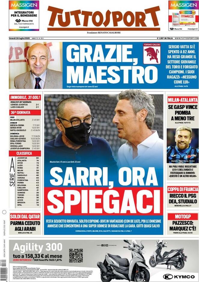 "Sarri, ora spiegaci". In apertura, l'edizione odierna di Tuttosport dedica spazio al ko di ieri dei bianconeri. Festa Scudetto rinviata. Solito copione: Juve in vantaggio (con De Ligt), poi le ennesime amnesie che consentono ad una super Udinese di ribaltare la gara. Gotti quasi salvo, alla Vecchia Signora servono tre punti per festeggiare il titolo.