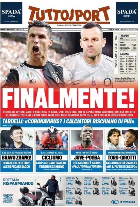 "Sport senza tifosi sino al 3 aprile, Lione-Juve a porte chiuse" sono alcuni dei titoli del quotidiano Tuttosport oggi in edicola. Per un mese i tifosi non potranno andare allo stadio, chiuso lo Stadium per il ritorno coi francesi, intanto rinviata - ieri - la semifinale di Coppa Italia tra Napoli e Inter. In basso il quotidiano parla di Zhang ma anche di Pogba, nome caldissimo per la prossima estate della Juventus.