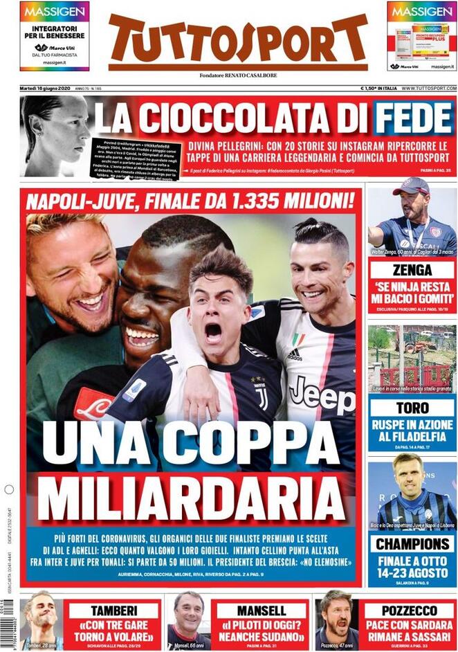 L'edizione di oggi de Tuttosport apre in prima pagina con la finale di Coppa Italia che vedrà di fronte Napoli e Juventus, ed il valore economico che i due organici rappresentano: una finale da 1.335 milioni di euro - si legge in apertura - con le scelte fatte da De Laurentiis ed Agnelli che di fatto hanno premiato gli stessi presidenti nel tempo.