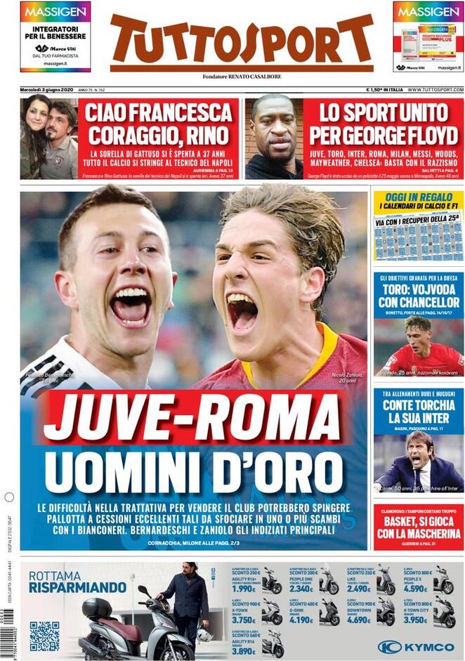 L'edizione di oggi de Tuttosport apre in prima pagina dedicando spazio anche a Rino Gattuso e la tragica scomparsa della sorella Francesca. Tutto il mondo del calcio, di fatto, si è stretto attorno all'allenatore del Napoli. Spazio anche al caso George Floyd ed il mondo dello sport che si è attivato per sostenere la campagna anti razzismo sui social.