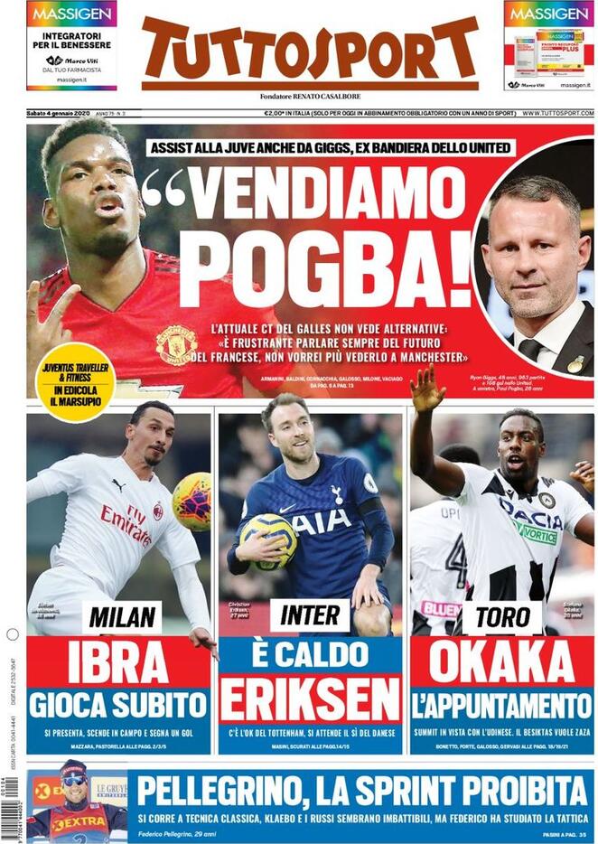 "Vendiamo Pogba", è il virgolettato d'apertura di Tuttosport, ma che è di Giggs, ex bandiera dello United, stufo delle continue voci sul futuro del centrocampista. In basso box per l'arrivo di Ibra al Milan, l'Inter che lavora su Eriksen, in scadenza a giugno, ed Okaka che è nel mirino del Torino per sostituire Zaza.