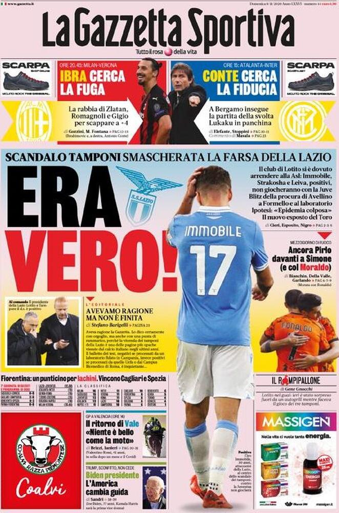 "Aveva ragione la Gazzetta. Lo dico certamente con orgoglio, ma anche con una punta di rammarico, perché la vicenda dei tamponi della Lazio è una delle pagine più opache vissute dal calcio italiano negli ultimi anni", scrive in un editoriale il direttore della Gazzetta dello Sport, Stefano Barigelli sottolineando che "il balletto dei test, negativi se processati da un laboratorio fidato in Campania, invece positivi se processati da quello Uefa o dal Campus Biomedico di Roma, è inquietante".