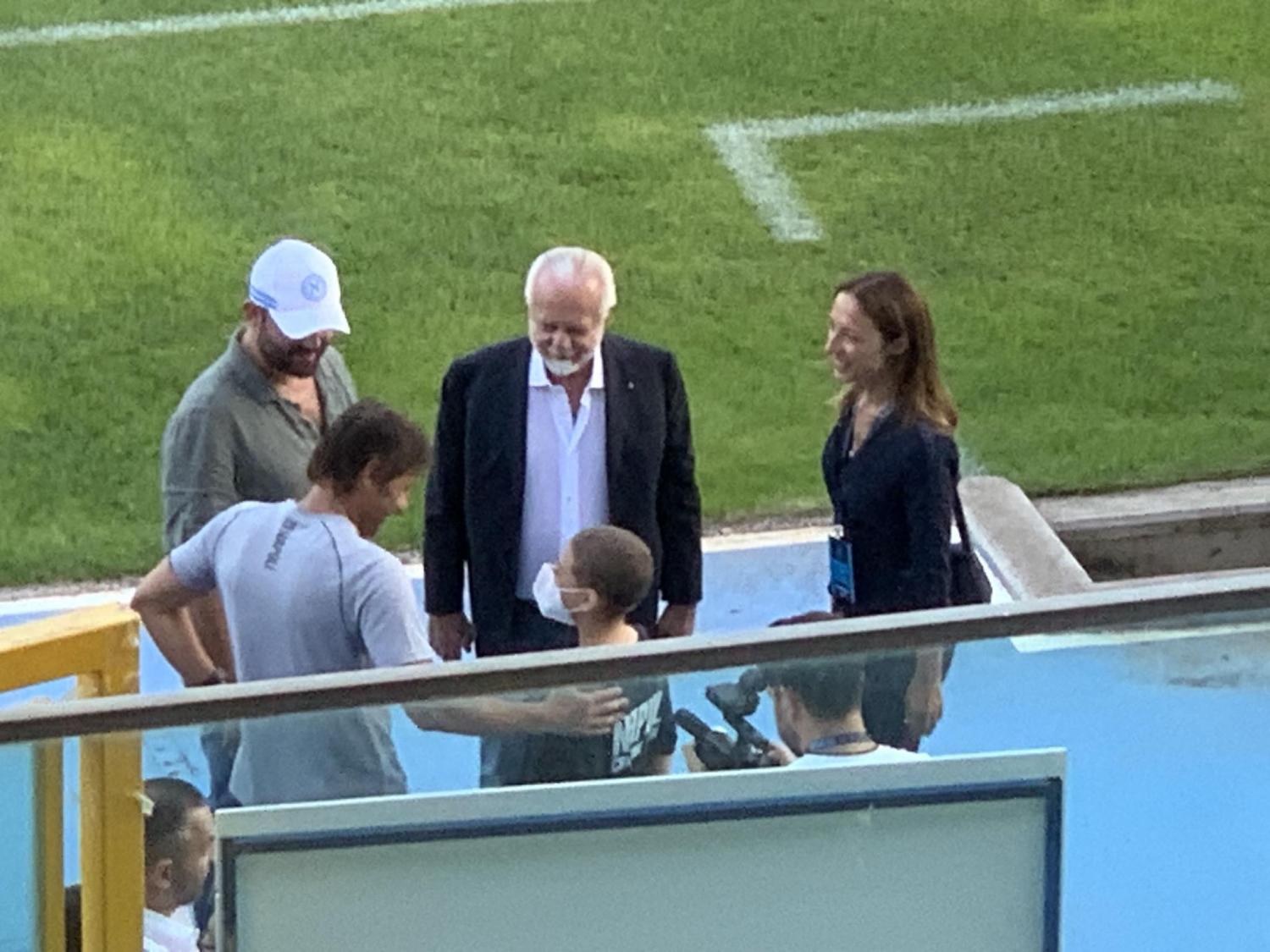Il presidente Aurelio De Laurentiis è arrivato in ritiro a Castel di Sangro ed ha assistito per la prima volta in quel di Abruzzo all'allenamento del Napoli, durante la sessione odierna. ll patron azzurro, insieme al vice presidente Edo De Laurentiis e Antonio Conte, si è poi intrattentuo alla fine della seduta a parlare con un bambino a bordo campo.