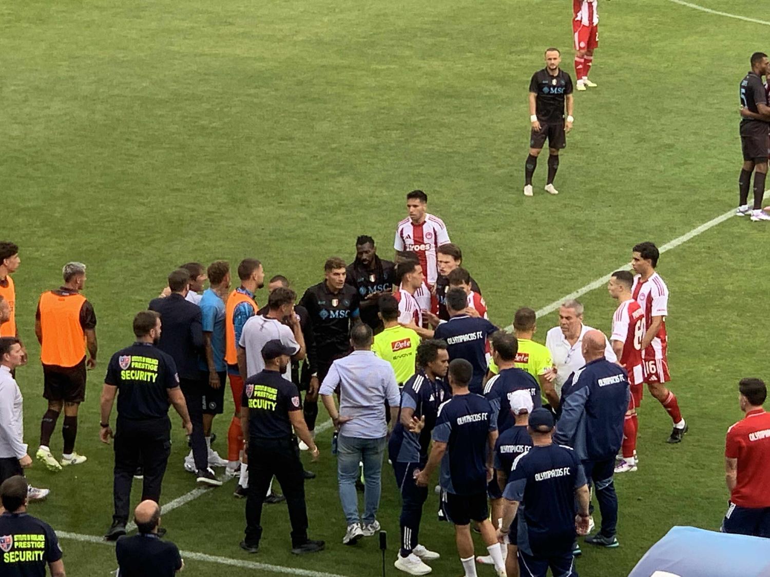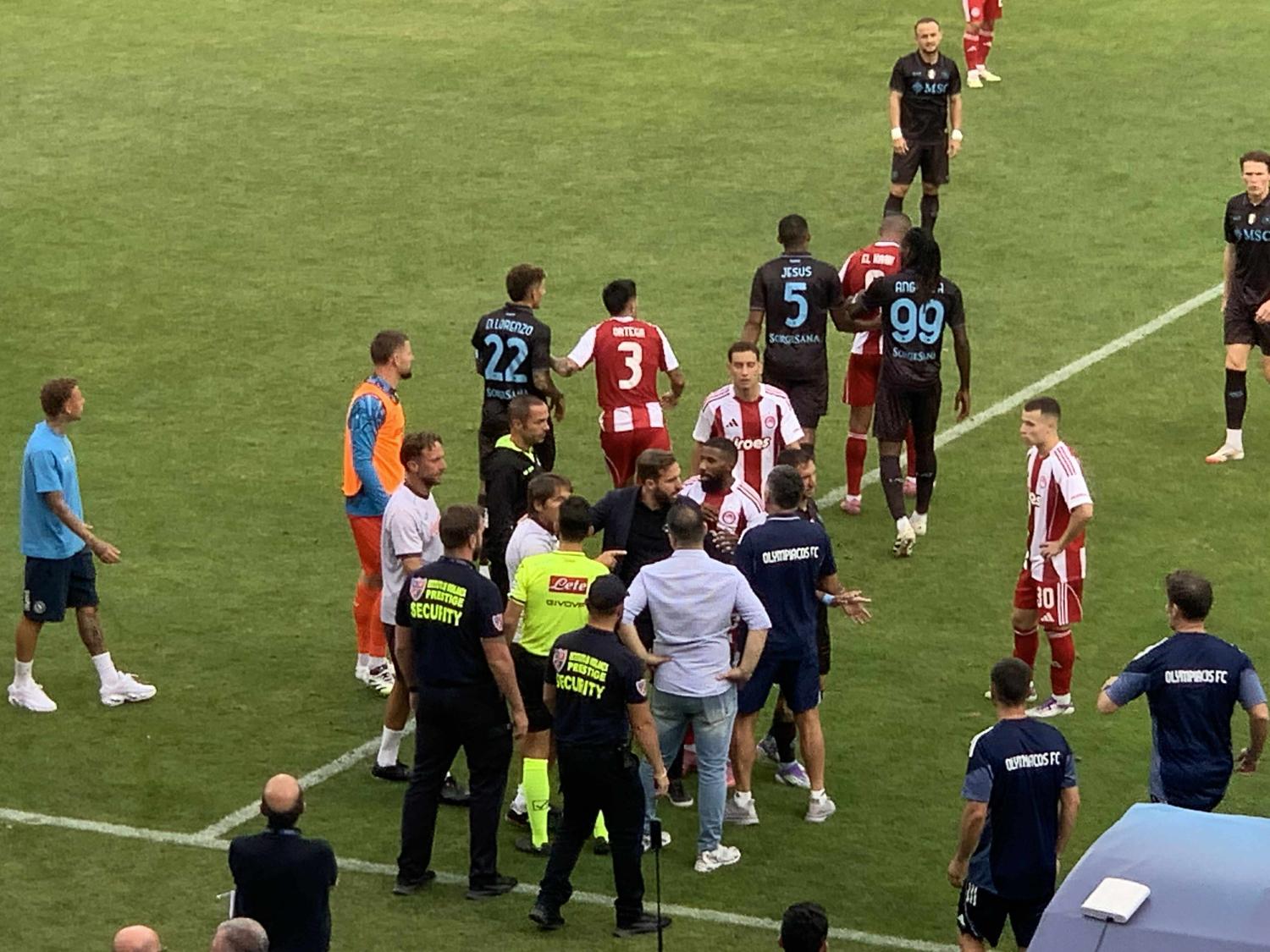 Ha poco di amichevole Napoli-Olympiacos, al 35' infatti si accende una rissa sul campo del Teofilo Patini. All'ennesimo intervento duro dei greci, fallaccio su Rrahmani a palla lontana, capannello di uomini a contatto con Antonio Conte che entra in campo furioso per protestare. Di seguito le immagini raccolte dai nostri inviati a Castel di Sangro.