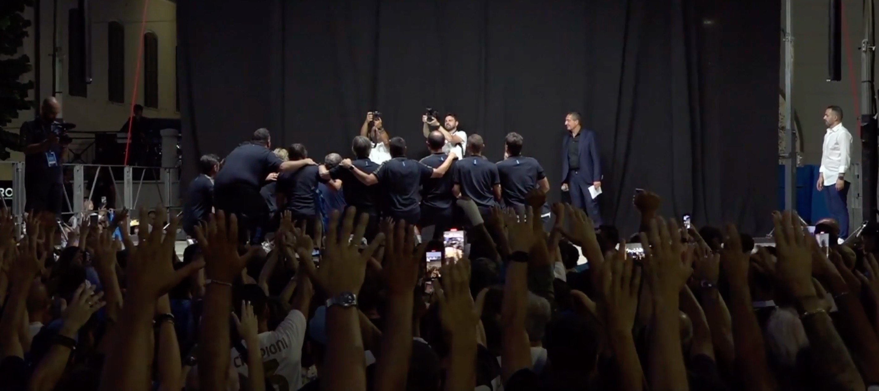 Antonio Conte e il suo staff sono stati catturati dal calore e dalla passione dei tifosi del Napoli. L'atmosfera e il clima con cui i supporter azzurri li hanno accolti anche ieri sera nell'incontro in piazza a Castel di Sangro, ha fatto innamorare i membri del nuovo staff partenopeo. Oltre ai numerosi ringraziamenti da parte di Conte e Oriali, lo stesso mister alla fine dell'evento ha anche chiesto di fare una foto con tutto il pubblico presente. Di seguito la foto