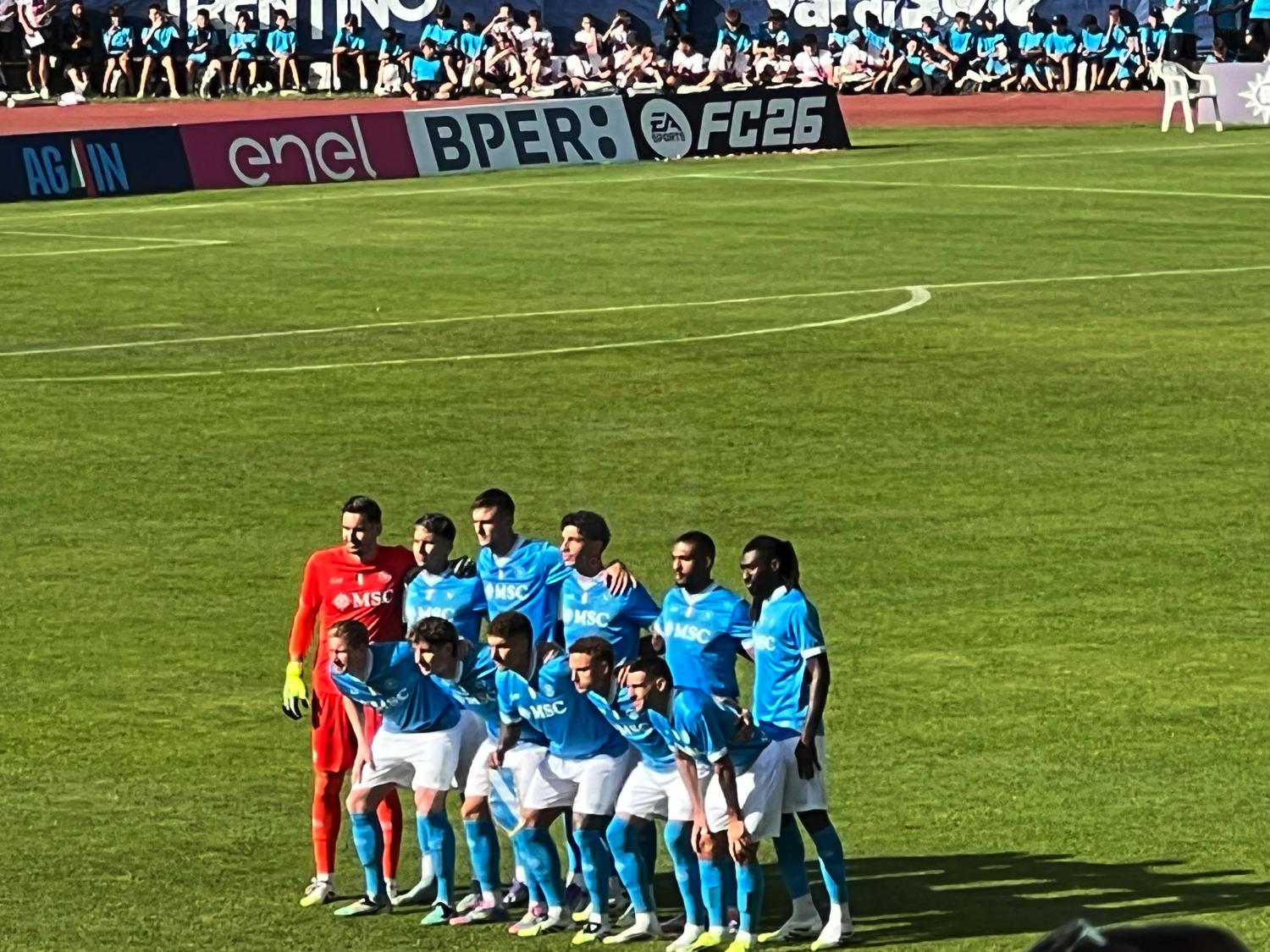 Parte la stagione 2025/26 dei campioni d'Italia con il primo test amichevole del ritiro di Dimaro-Folgarida contro l'Arezzo. Il Napoli di Antonio Conte si schiera così: Meret; Di Lor,nzo Marianucci, Juan Jesus, Olivera; Anguissa, Hasa, De Bruyne; Zanoli, Lucca, Lang. All. Conte. Di seguito il primo scatto che ritrae la formazione azzurra nel pre-partita dell'amichevole contro i toscani,