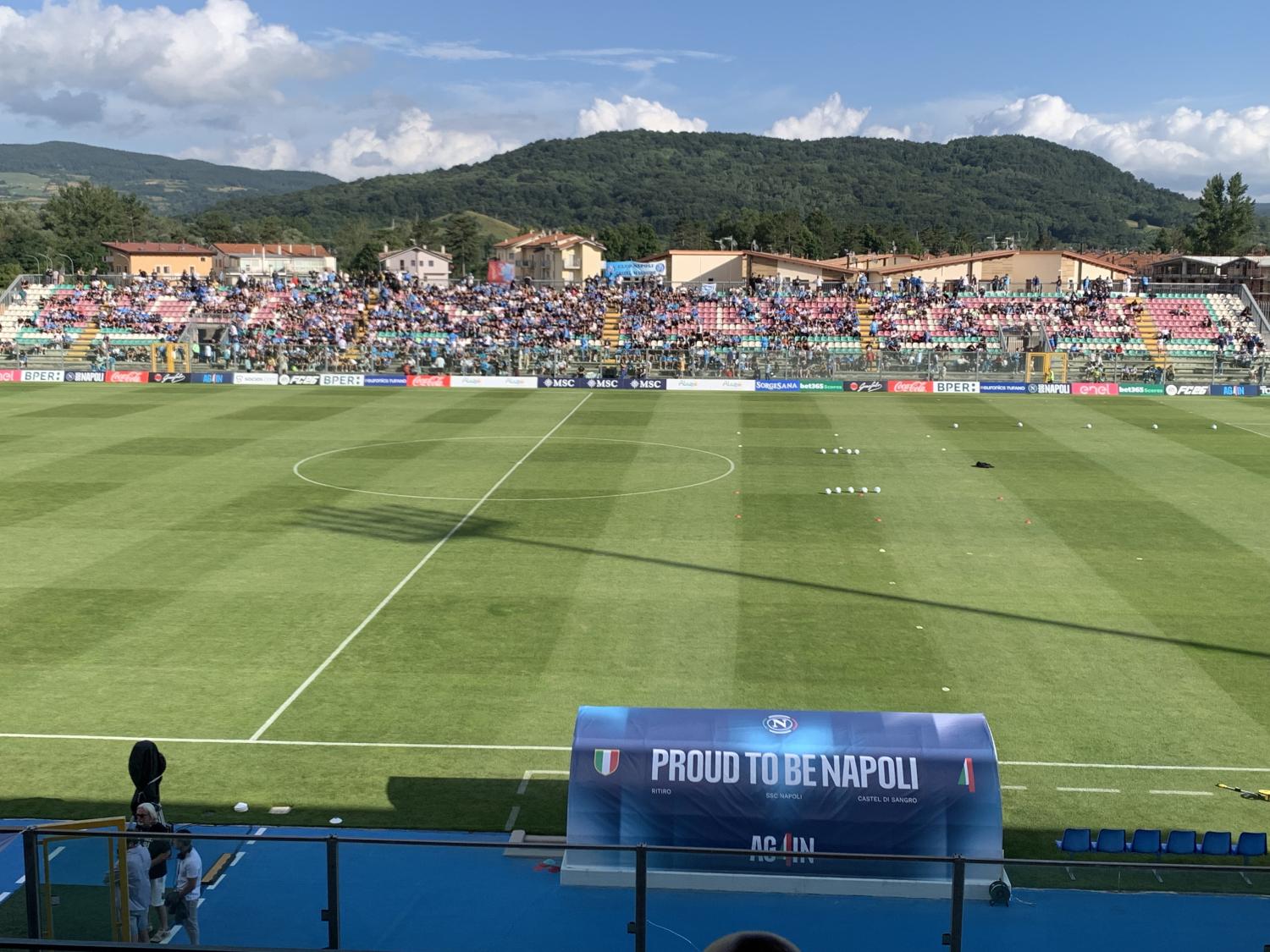 A più di un'ora da Napoli-Brest, si riempie velocemente lo Stadio Patini di Castel di Sangro. Grandissima affluenza in occasione della prima amichevole dei campioni d'Italia nella seconda parte della preparazione estiva in Abruzzo. L'impianto dell'Alto Sangro farà registrare stasera il sold-out, 7200 tagliandi esauriti da giorni. Di seguito lo scatto raccolto dai nostri inviati.