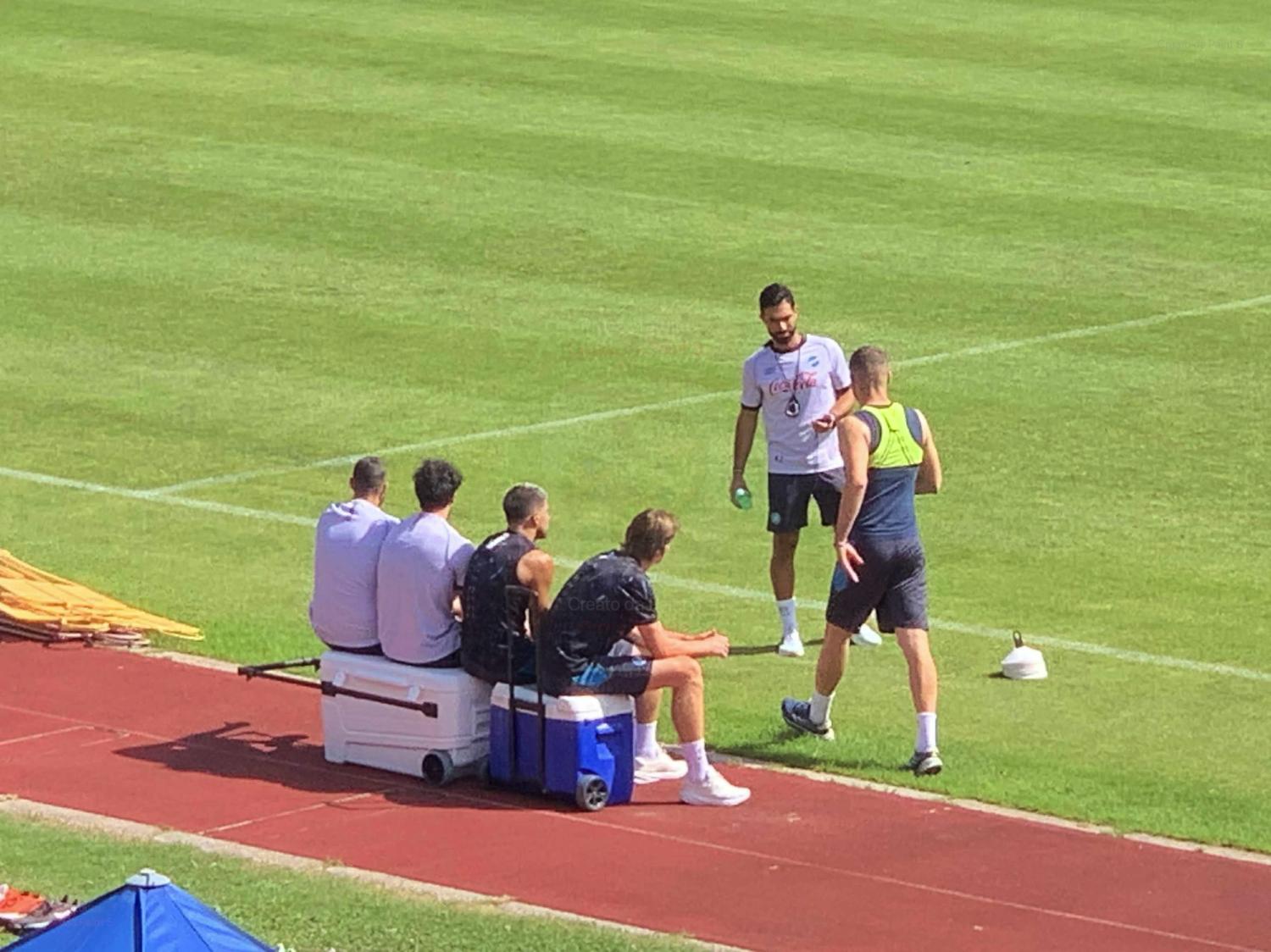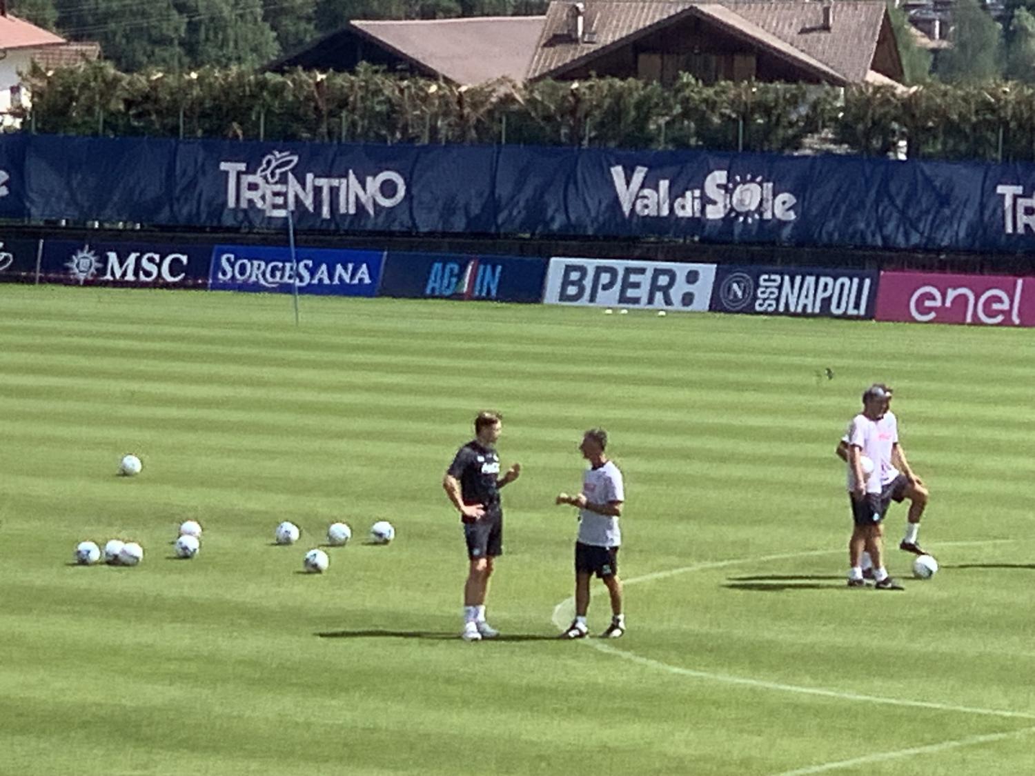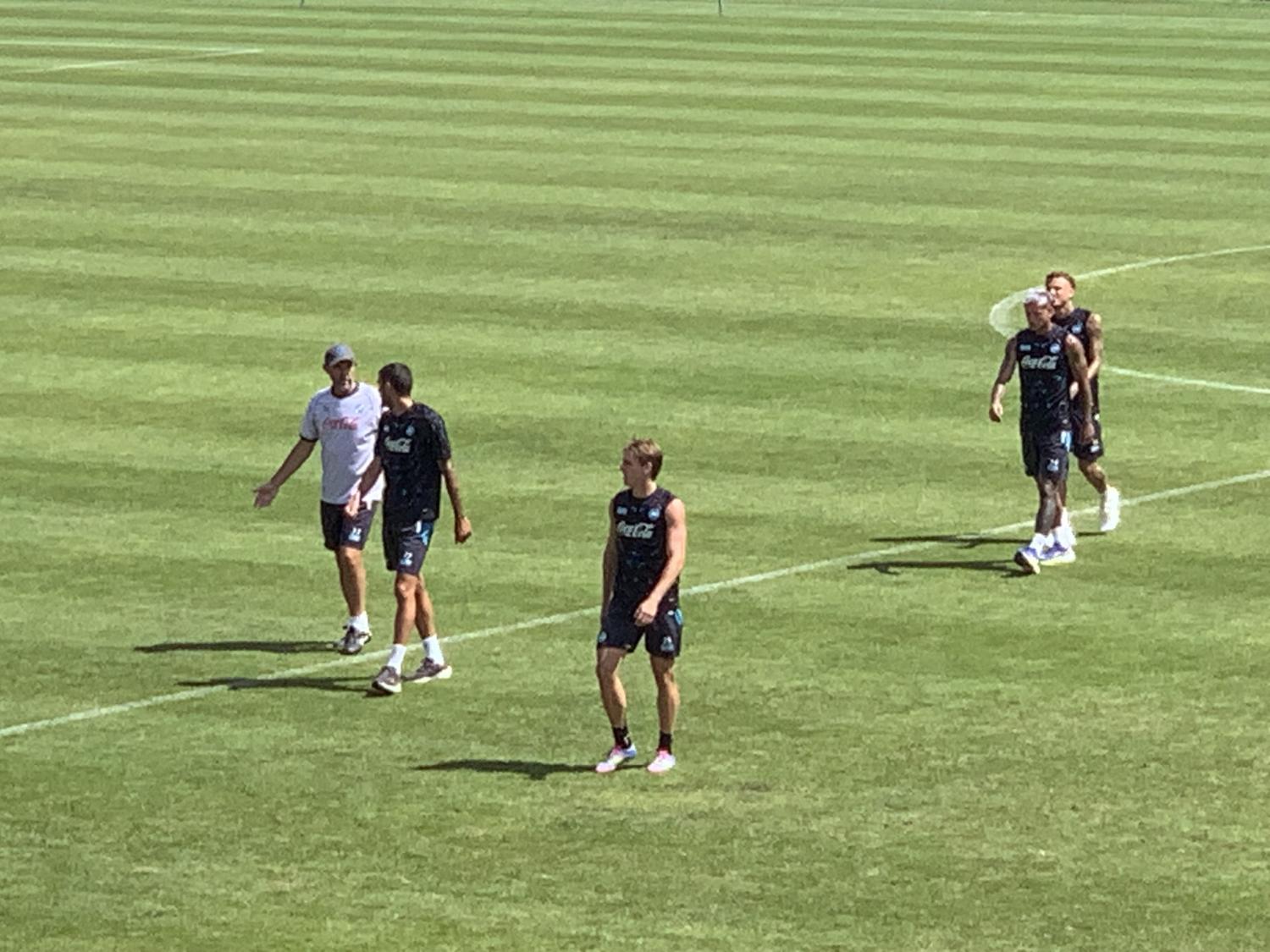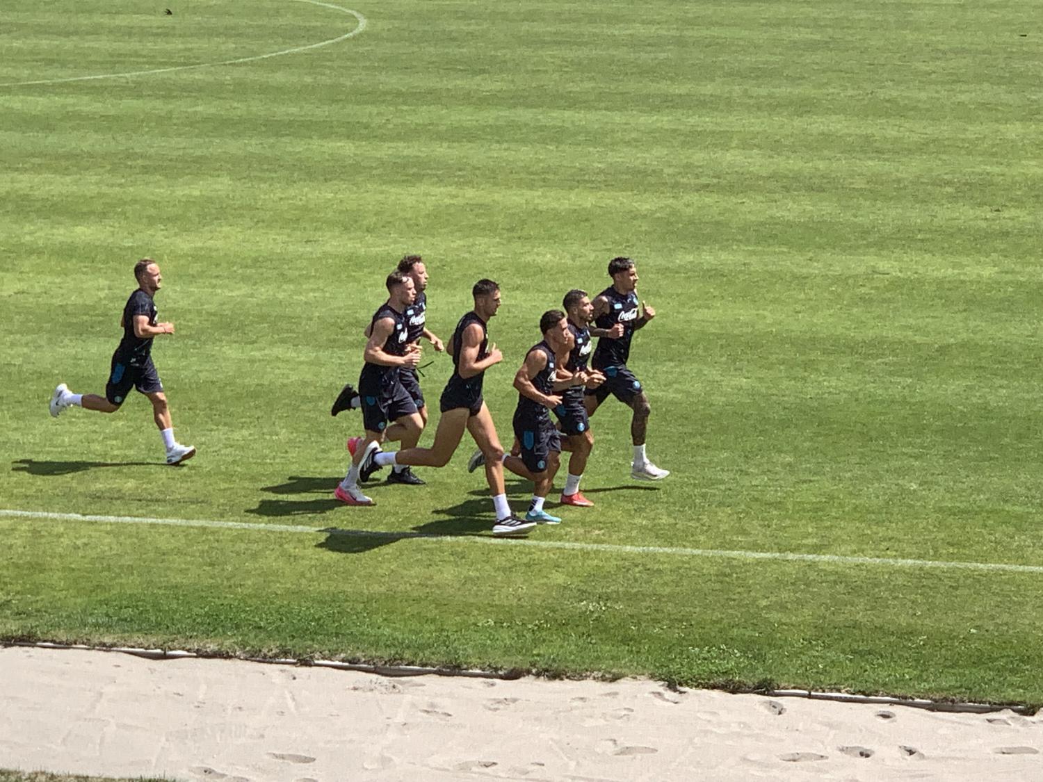 Scott McTominay e Giovanni Simeone fermi ai box per la prima parte dell'allenamento con la palla. Entrambi non sono alle prese con degli infortuni, ma con dei semplici affaticamenti dati dalla preparazione. In un primo momento i due azzurri assistono all'allenamento dei compagni seduti a bordo campo sul contenitore delle bibite. In seguito si allenano a parte senza palla insieme a Saco, Obaretin e Sgarbi. Quando il gruppo inizia il lavoro a secco e le ripetute tutti vengono integrati e lavorano insieme agli altri.