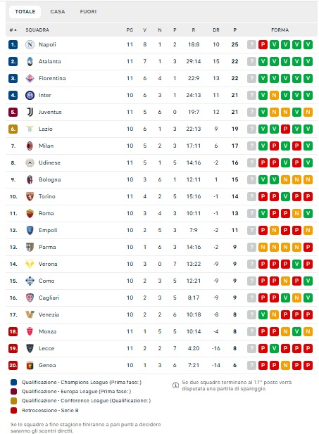 CLASSIFICA - Anche la Fiorentina a-3 dal Napoli: i viola agganciano l'Atalanta al 2° posto