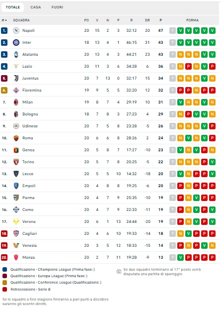 Finisce pari tra Atalanta e Juventus, 1-1, recupero della 19ª giornata di Serie A. La squadra di Gasperini recupera solo un punto sul Napoli capolista di Antonio Conte e aggancia l'Inter al secondo posto in classifica a 43 punti. Altro pareggio per la Juventus di Thiago Motta che resta quinta, ben 13 i punti in meno degli azzurri. Di seguito la classifica aggiornata.