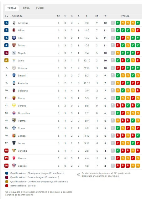 SERIE A - LA CLASSIFICA AGGIORNATA