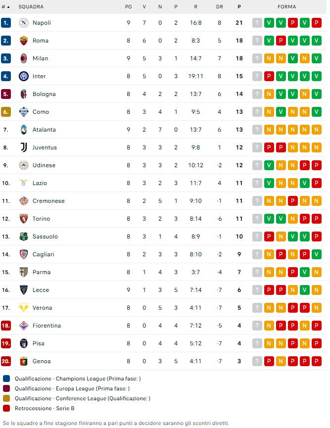 I rossoneri di Massimiliano Allegri, in particolare, agganciano la Roma a quota 18 punti, ma domani Gasperini - all’Olimpico con il Parma - può allungare nuovamente, e inoltre il Milan finisce scende a -3 dalla capolista Napoli e a portata di aggancio dall’Inter. A sua volta l’Atalanta riprende il Como, ma con un turno in più sarà sicuramente agguantata o superata da almeno una tra Juventus e Udinese, che seguono la Dea in classifica. Di seguito la classifica aggiornata della Serie A.