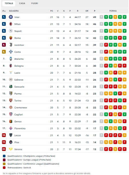 Il Milan vince a fatica contro il Lecce a San Siro, ma ottiene tre punti preziosi per restare in pressing sulla capolista Inter: la squadra rossonera adesso dista infatti 3 punti dalla vetta. Terzultimo posto invece per i giallorossi, agganciati nelle scorse ore dalla Fiorentina. Di seguito la classifica aggiornata di Serie A, in attesa delle ultime due partite valide per la 21ª giornata.
