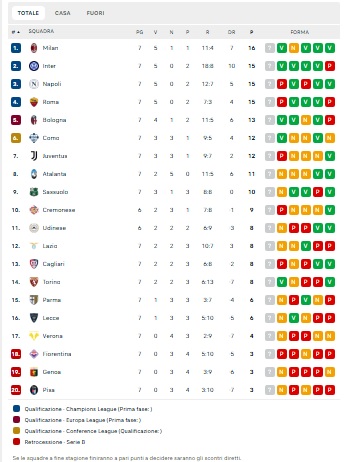 Con questo successo per 2-1, il Milan approfitta delle sconfitte di Roma e Napoli, risponde ai cugini dell'Inter e si porta da solo in testa alla classifica. Prosegue invece il momento nero della Fiorentina, sul fondo della graduatoria insieme a Pisa e Genoa. Di seguito la classifica di Serie A aggiornata.
