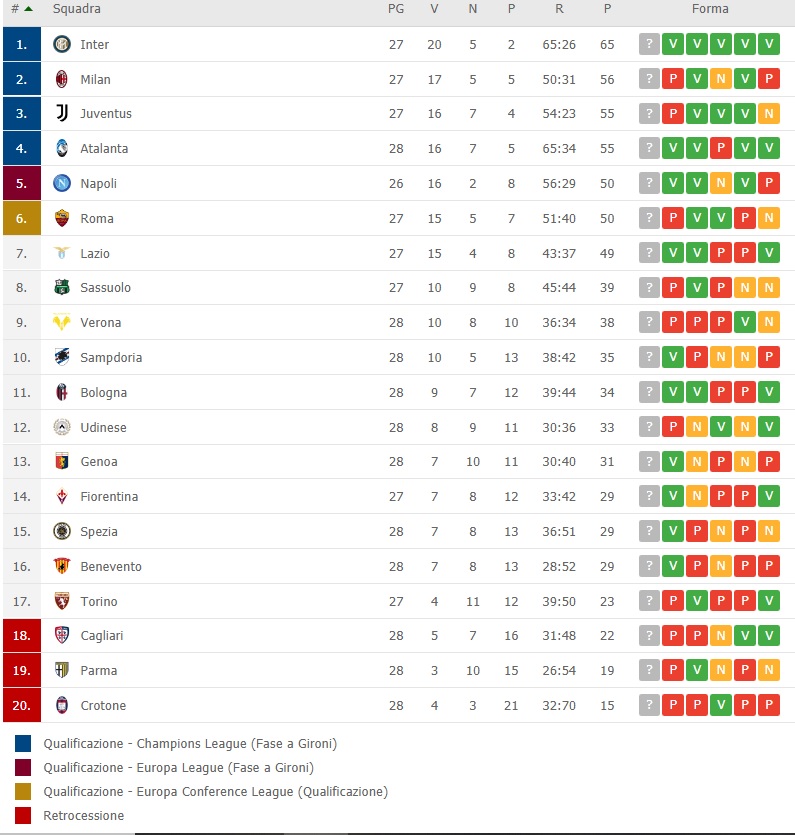 Clamorosa sconfitta casalinga della Juventus, battuta 1-0 dal Benevento di Filippo Inzaghi. Bianconeri raggiunti al terzo posto dall'Atalanta, vittoriosa nel lunch match. e a -10 dal primo posto. In attesa del big match di stasera a Roma, Napoli a -5 dalla zona Champions e dal duo. Lazio passa a Udine e si fa sotto, per ora il distacco dalla Roma e dagli azzurri è di solo un punto. In coda dopo i tre punti d'oro conquistati a Torino, il Benevento è a +7 sul terzultimo Cagliari.