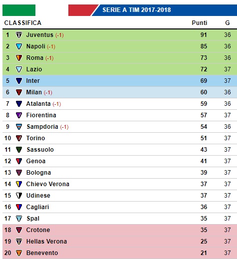Questa la classifica di Serie A dopo i match di questo pomeriggio. Inter ancora in corsa per la Champions: vincendo a Roma con la Lazio, grazie allo 0-0 dell'andata, sarebbe quarta nonostante l'arrivo a pari punti. Crotone terzultimo: al San Paolo si giocherá la salvezza, lotta che coinvolge ancora Spal, Cagliari, Udinese e Chievo.