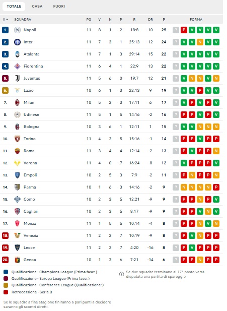 Con qualche difficoltà in più del previsto, l'Inter di mister Inzaghi ottiene tre punti fondamentali nella sfida casalinga col Venezia e accorcia nettamente sulla capolista Napoli. La vetta della classifica adesso dista solamente un punto. Di seguito la graduatoria aggiornata di Serie A, in attesa delle ultime due gare valide per l'undicesimo turno (in programma domani):