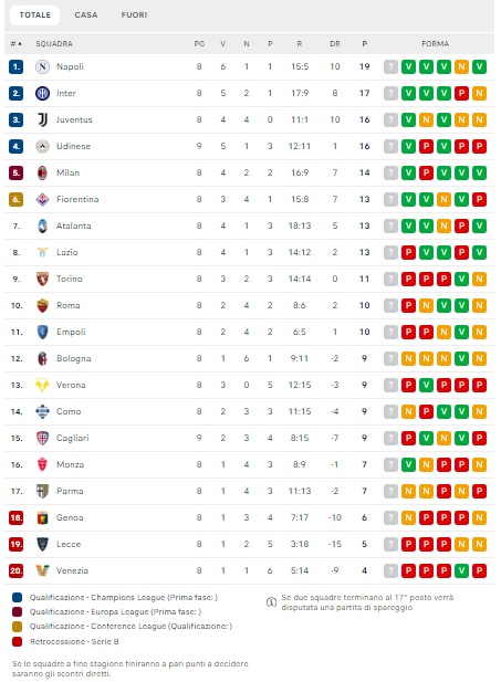 Questa la classifica aggiornata di Serie A dopo l'anticipo della 9ª giornata: