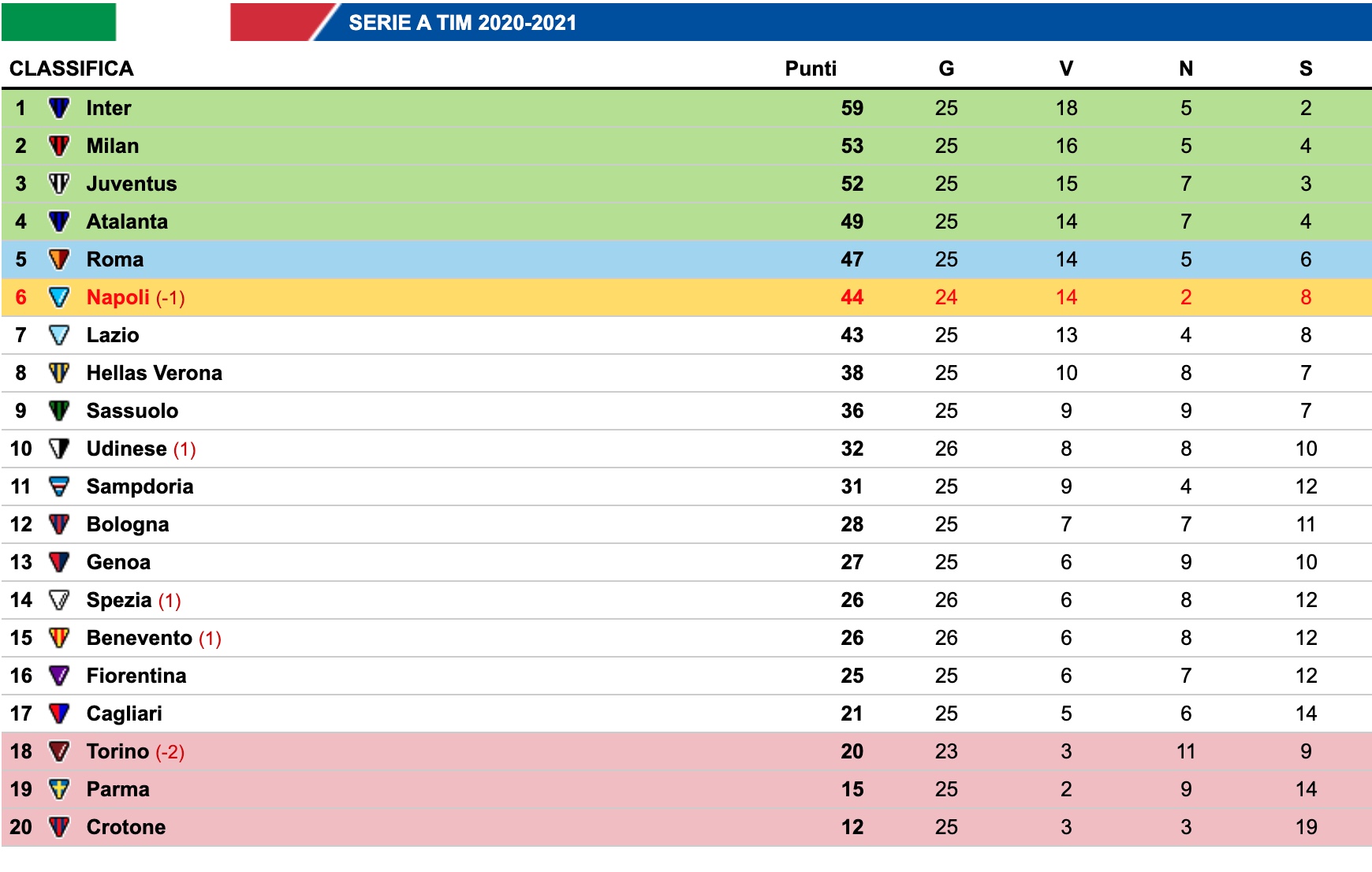 Con la vittoria in rimonta contro la Lazio, la Juventus sale a quota 52 punti, a -1 dal Milan che giocherà domani (ma considerando il recupero le squadre hanno lo stesso numero di partite). La Lazio resta settima, a -1 dal Napoli che domani può provare ad allungare ed allontanare così il settimo posto che da quest'anno porta in Conference League e non in Europa League. Nel pomeriggio il pari prezioso per Spezia e Benevento in chiave salvezza mentre l'Udinese sale ancora e condanna il Sassuolo all'anonimato. Di seguito la classifica completa