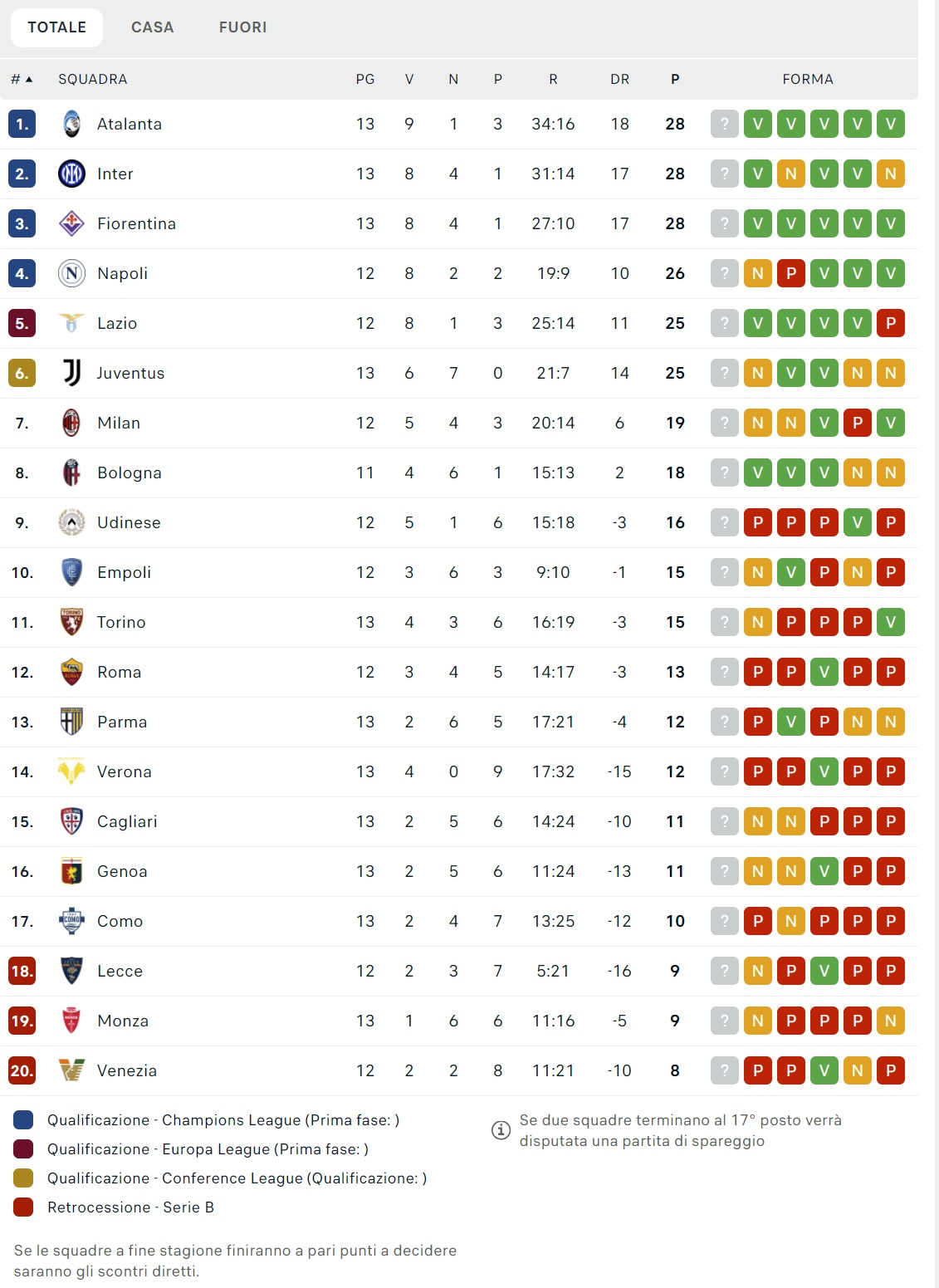 Settima vittoria consecutiva per la Fiorentina di Palladino, che batte il Como 2-0 fuori casa ed aggancia Atalanta e Inter in testa alla classifica con 28 punti. Il Napoli, che scenderà in campo alle 18 contro la Roma, sarà chiamato a rispondere. Gli azzurri allenati da Conte sono ora quarti, staccati di due punti. Di seguito la classifica aggiornata.