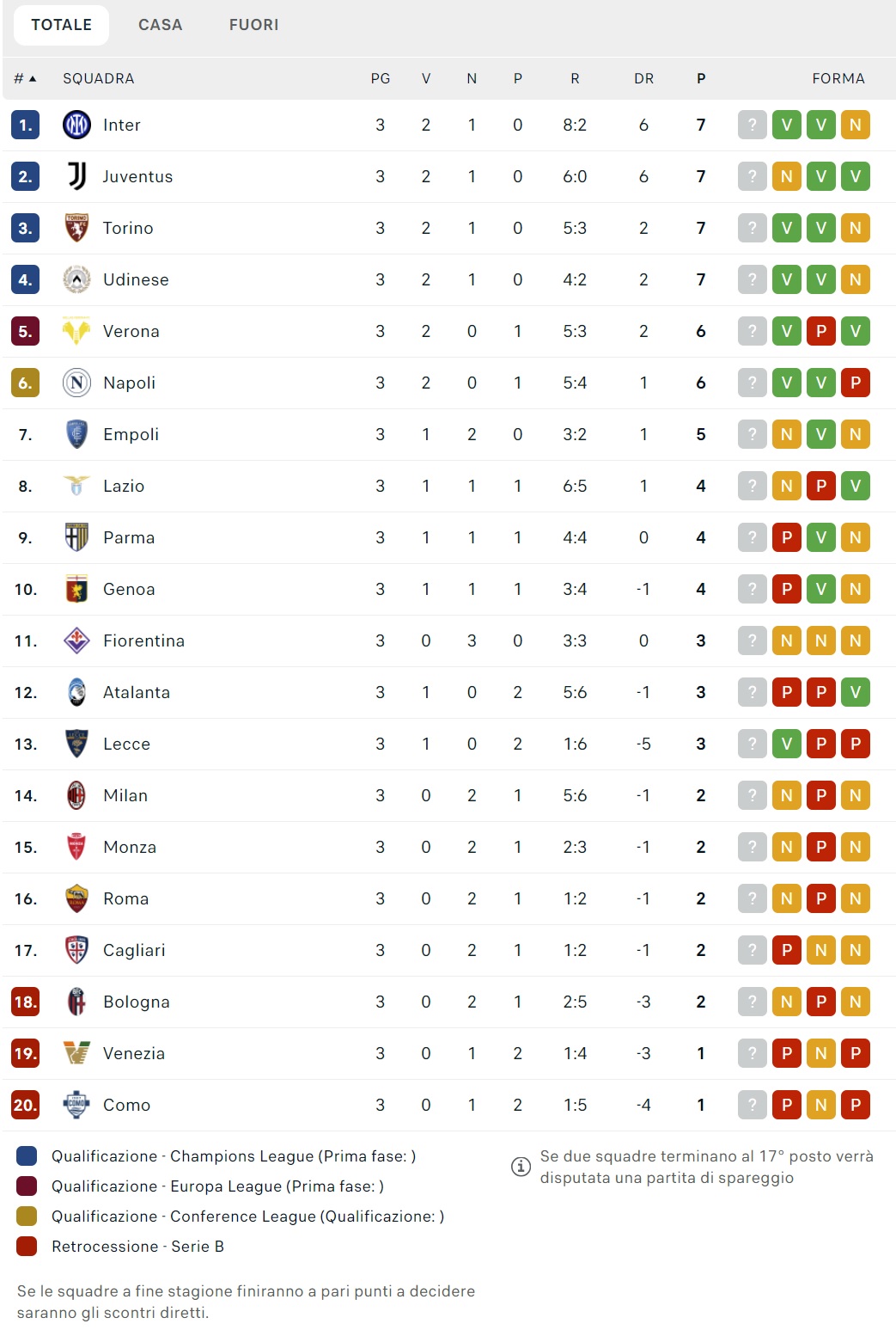 Finisce pari il posticipo tra Juventus e Roma, con i bianconeri che sprecano l'occasione di andare staccare le concorrenti. Quattro squadre comandano la classifica: Inter, Juventus, Torino e Udinese a 6 punti. Ad un punto c'è il Napoli di Conte a pari punti col Verona. Di seguito la classifica aggiornata.