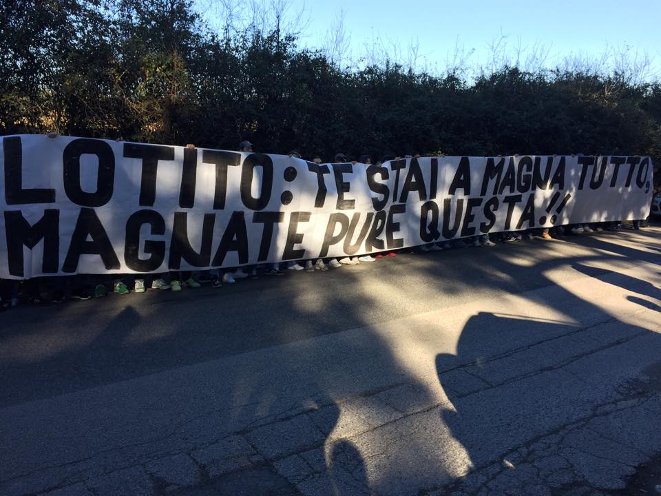 Situazione tesa in casa Lazio. Oggi è andata in scena al centro tecnico di Formello una contestazione descritta così dal portale LaLazioSiamoNoi.it: "Circa un centinaio i tifosi fuori dai cancelli del centro sportivo. Esposti due striscioni contro la dirigenza e contro i calciatori. Il primo recita così: "Lotito: te stai a magna tutto, magnate pure questa!", lenzuolo accompagnato da sacchetti di plastica contenenti sterco animale. E poi l'altro: "Squadra: nella m***a volete farci affogare, ma prima ve la facciamo mangiare". Il tutto seguito da cori contro il presidente della Lazio".