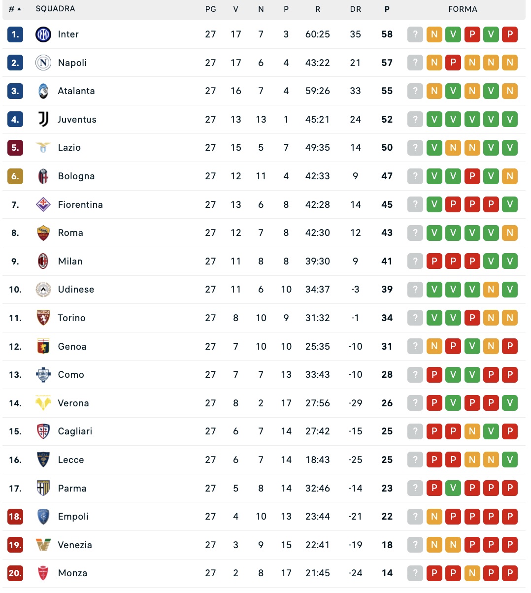 Di seguito la classifica aggiornata dopo la 27ª giornata di Serie A: