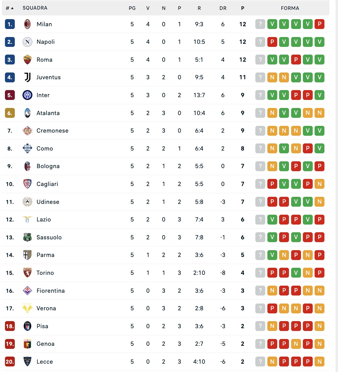 Di seguito la classifica di Serie A dopo la quinta giornata: