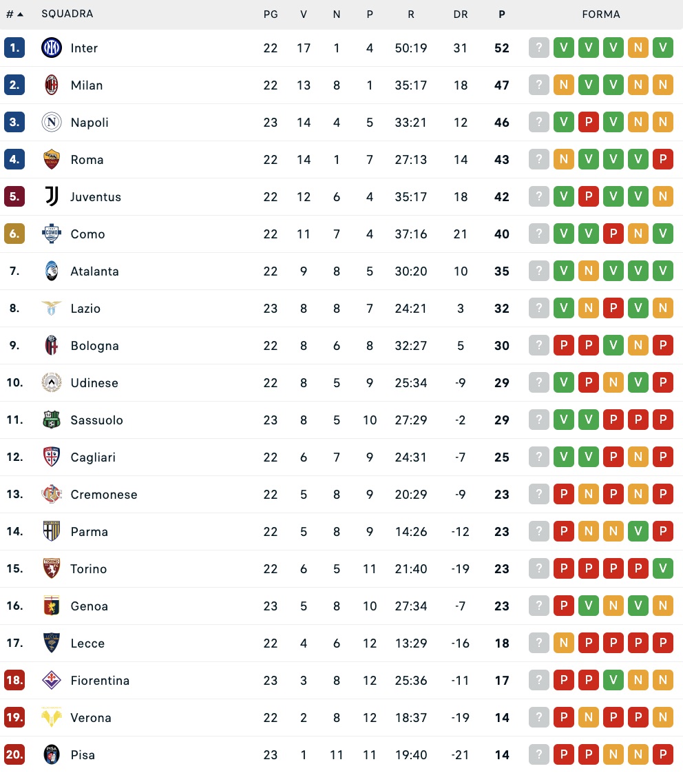 Serie A, classifica: il Napoli si porta a +3 sulla Roma e +4 sulla Juve (per ora)