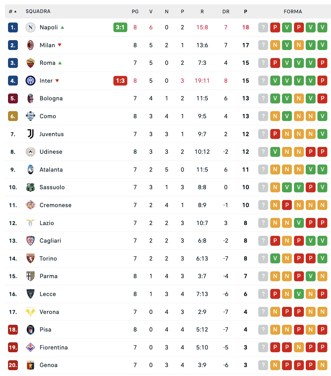 Di seguito la classifica di Serie A aggiornata dopo Napoli-Inter 3-1: