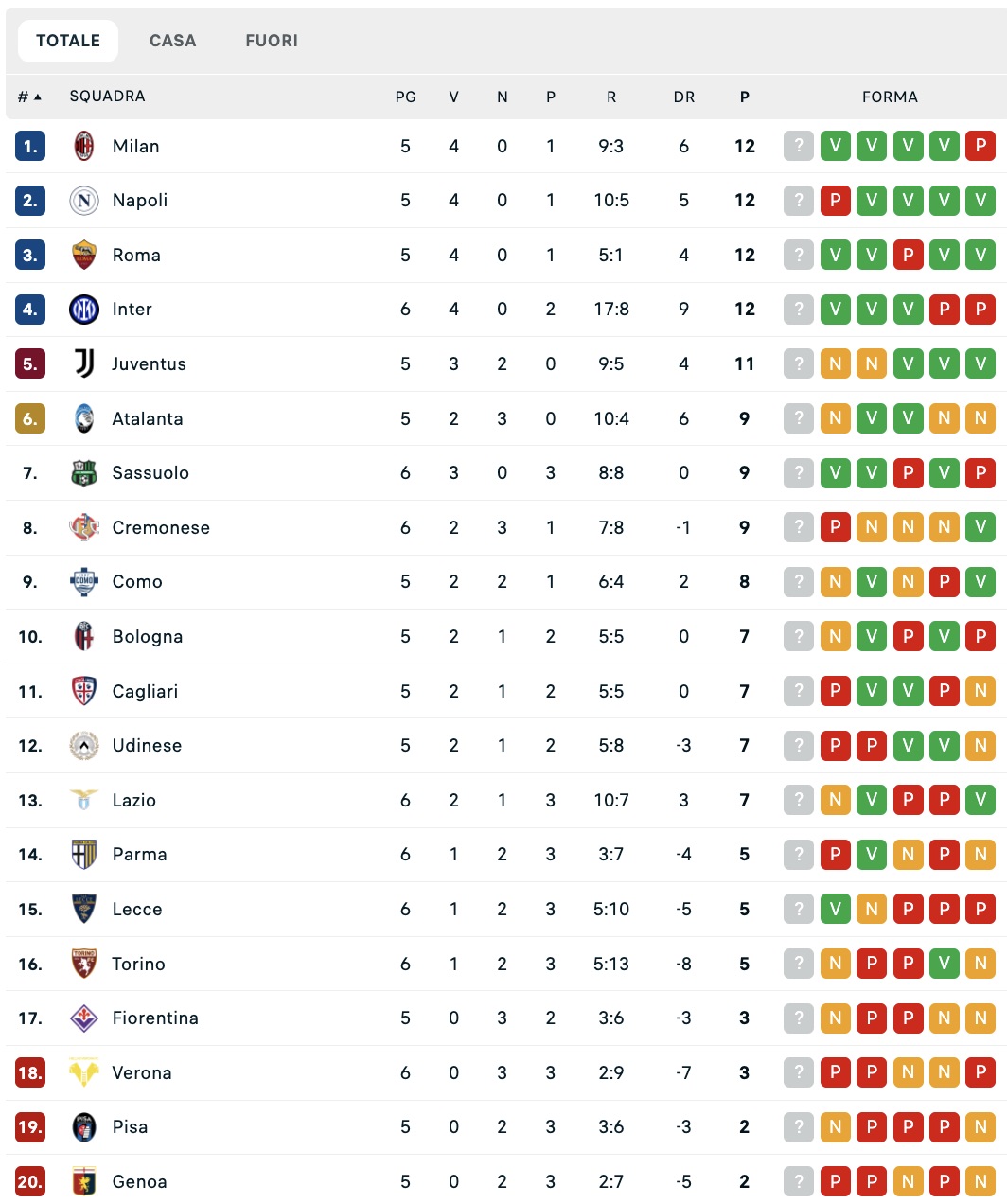Milan 12 punti (5 partite giocate)