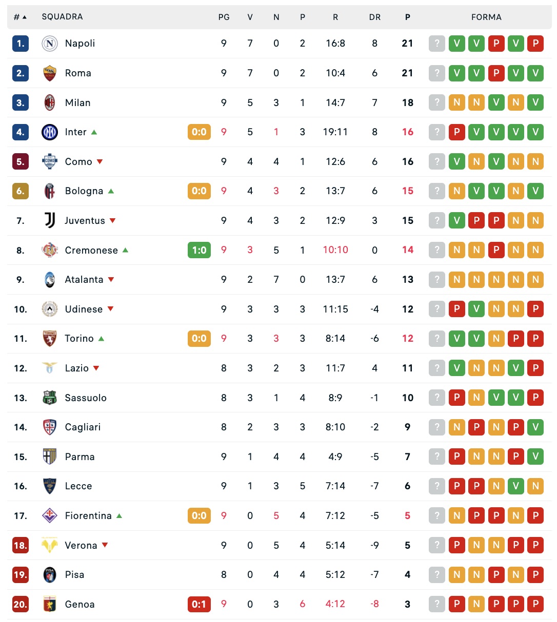 Dopo le tre partite delle 18:30 di questo turno infrasettimanale, la classifica vede la Roma nuovamente in testa a pari punti con il Napoli; la Juventus torna a vincere e si piazza a quota 15, a sei lunghezze dal primo posto, mentre il Como di Fabregas è in piena zona Europa e continua a sognare.