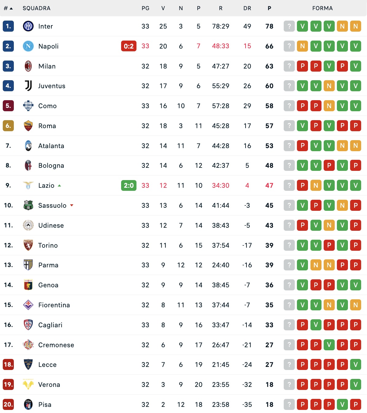 1 - Inter 78 punti, 33 partite giocate