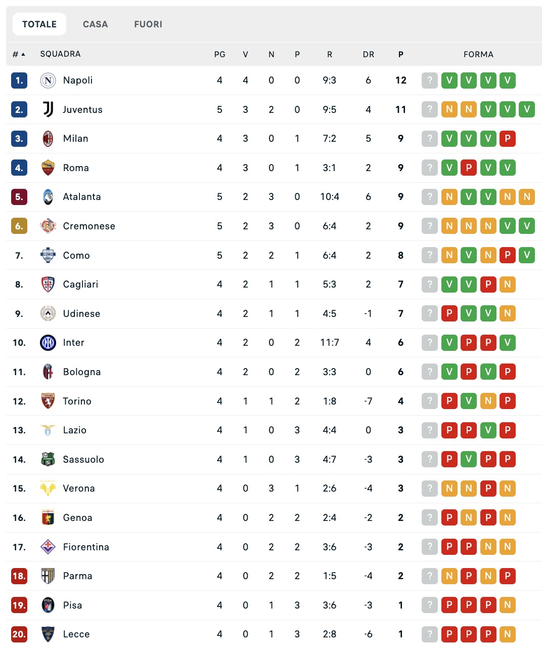 Di seguito la classifica aggiornata dopo Juventus-Atalanta 1-1: