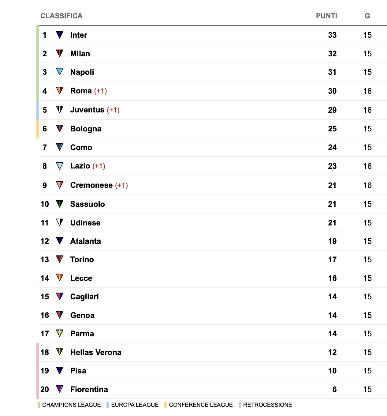 Di seguito la classifica di Serie A aggiornata dopo Lazio-Cremonese 0-0 e Juventus-Roma 2-1: