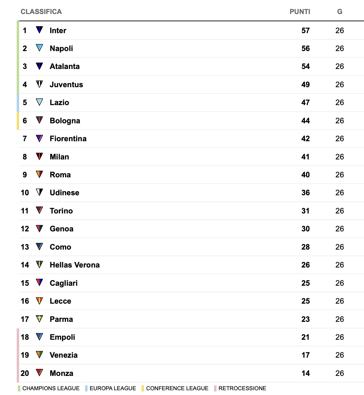 La classifica aggiornata di Serie A:
