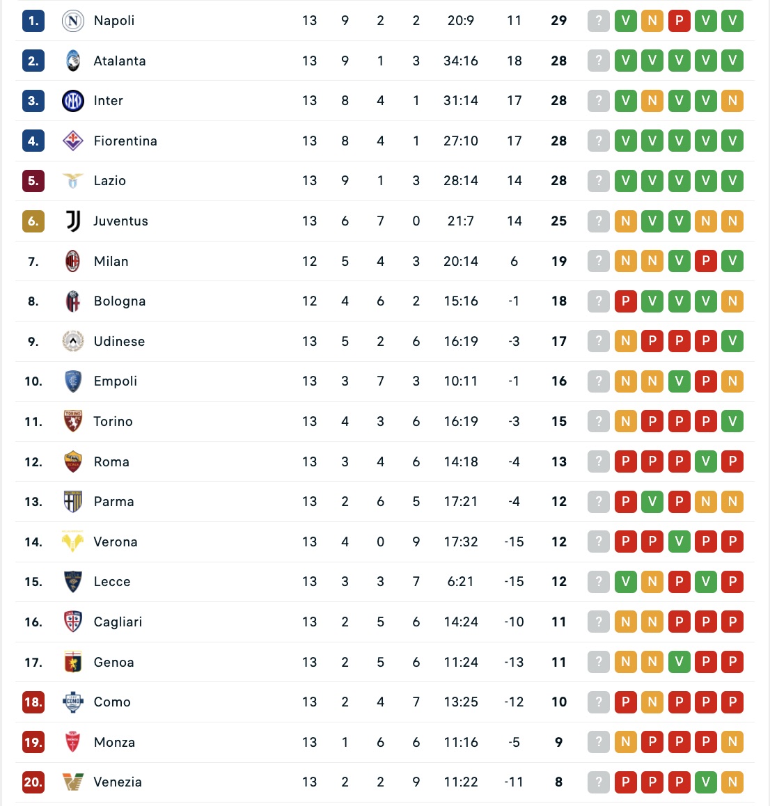 Con lo 0-1 di Venezia-Lecce si chiude la tredicesima giornata di Serie A 2024/25. Continua ad esserci traffico nelle parti alte della classifica: il Napoli batte la Roma e mantiene il primato, ma vincono anche Atalanta, Inter, Lazio e Fiorentina che sono dietro rannicchiate in un solo punto. Pareggio invece tra Juve e Milan che fa perdere un po' di terreno a entrambe.