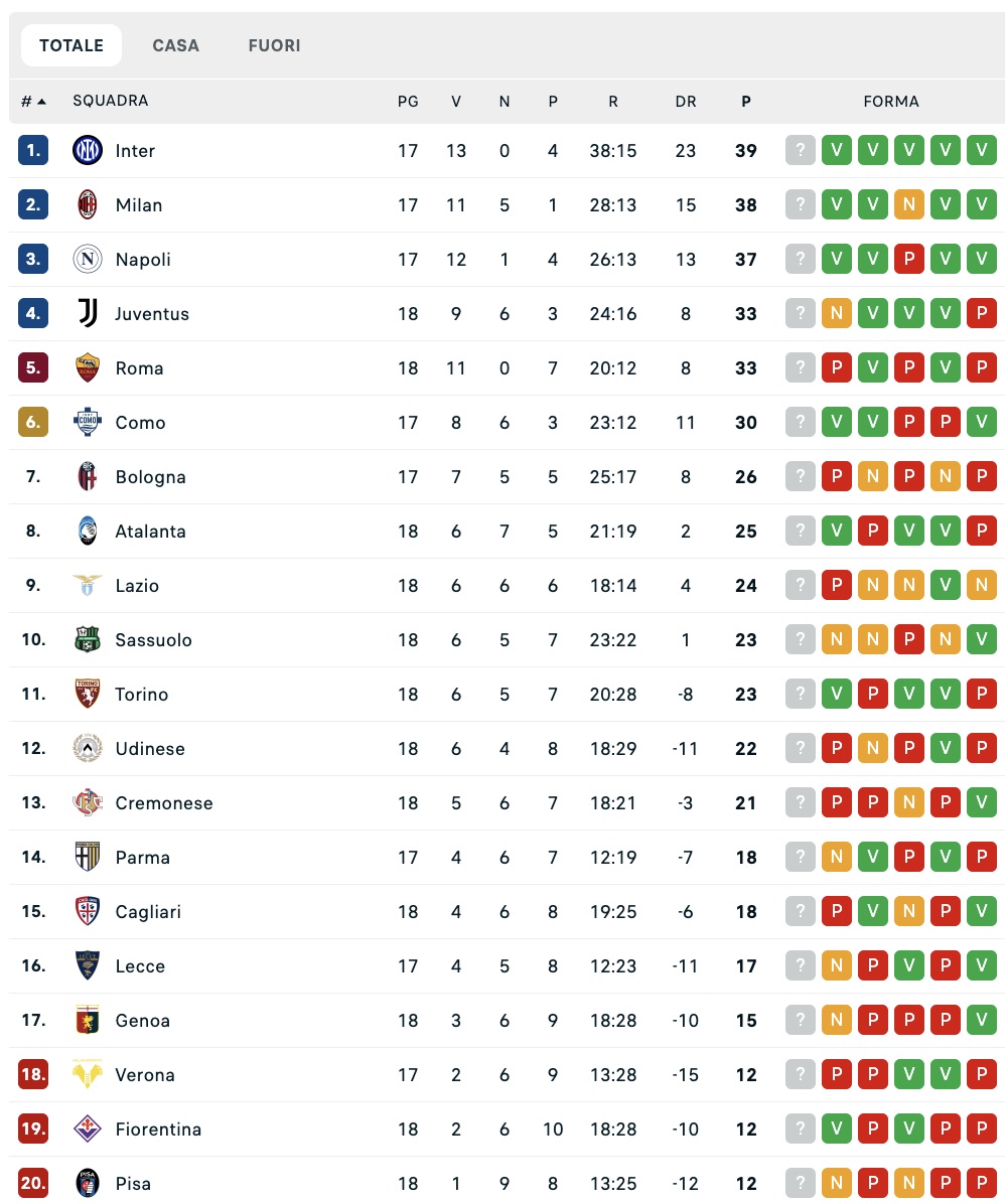 Serie A, la classifica dopo la 18ª: l'Inter resta in vetta, Napoli e Milan tengono il passo