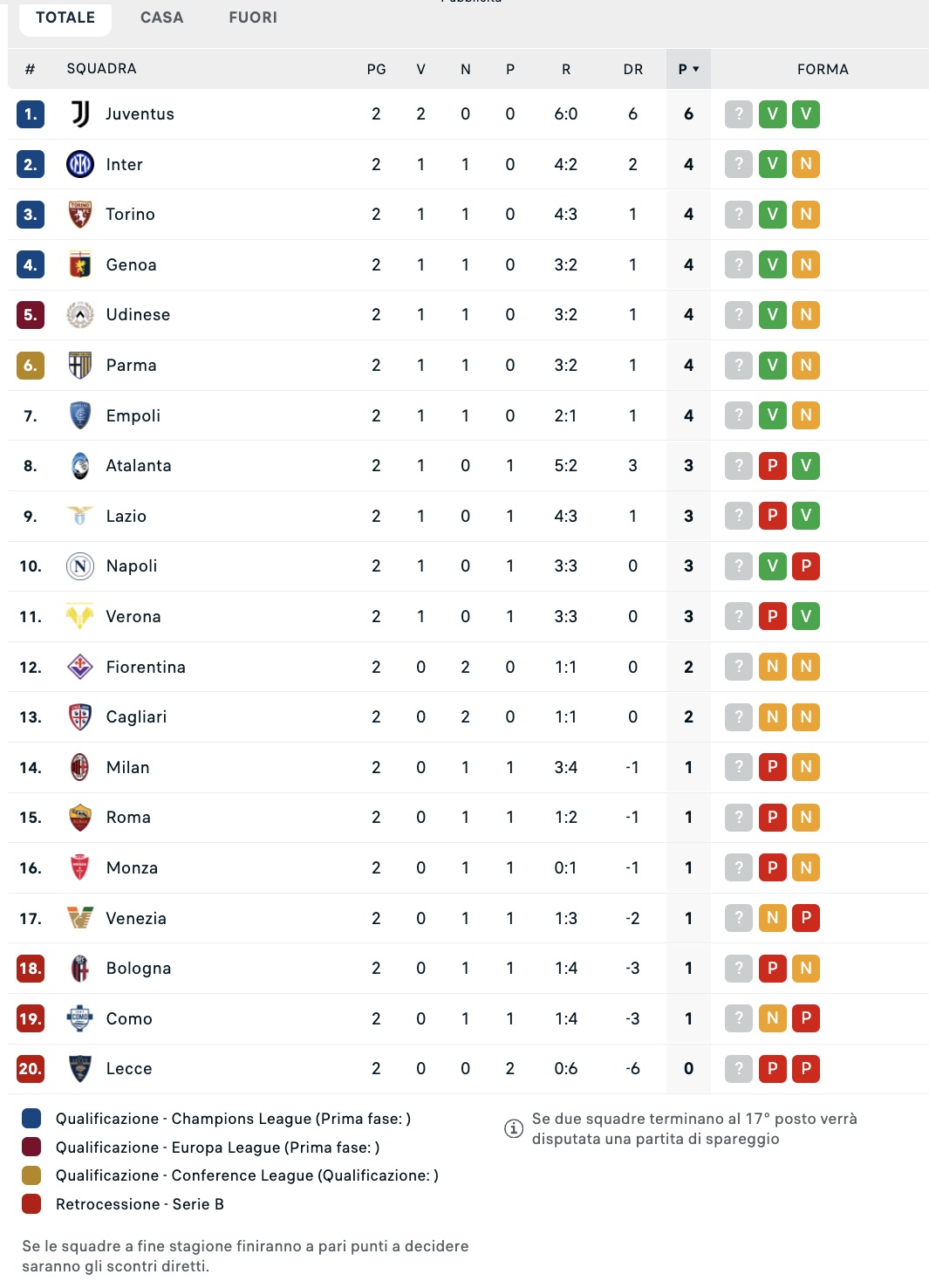 Con la partita del Bentegodi tra Hellas Verona e Juventus, si chiude la seconda giornata di Serie A 2024-25. Dopo due turni la classifica vede solo i bianconeri di Thiago Motta a punteggio pieno, mentre l'unica squadra ad aver perso entrambe le gare è il Lecce. Il Napoli di Antonio Conte insegue a quota 3.