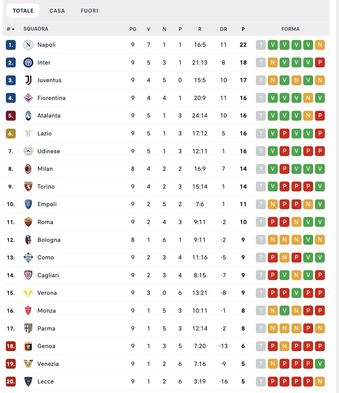 Serie A, la classifica dopo la 9ª giornata: allungo Napoli, dietro 6 squadre in 2 punti