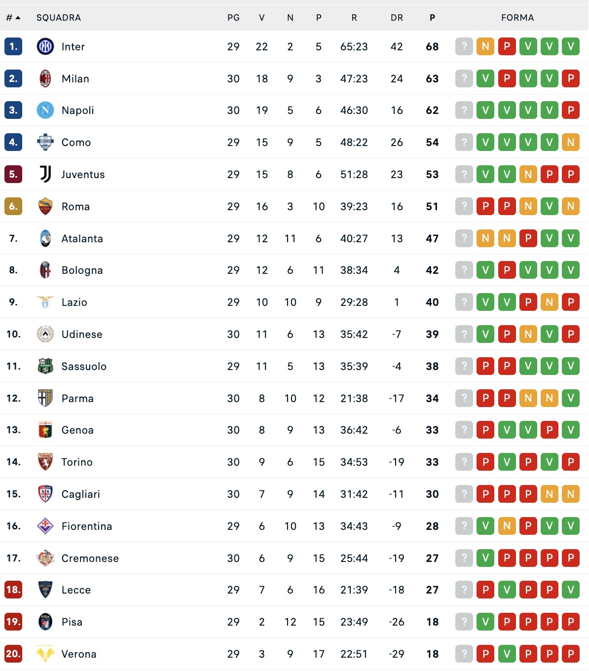Di seguito la classifica aggiornata di Serie A: