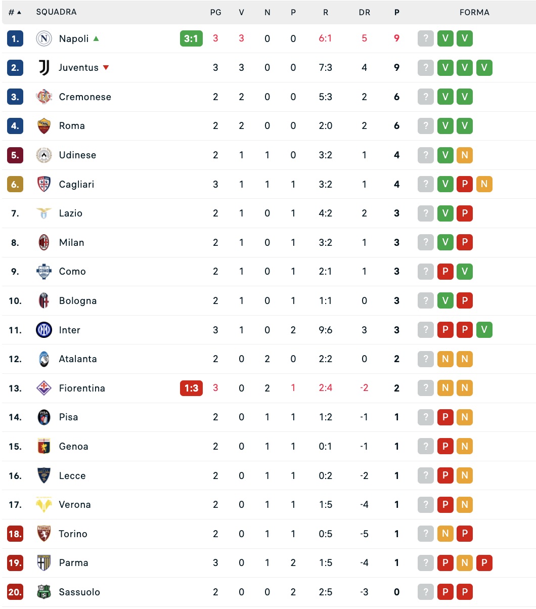 Il Napoli domina, si diverte e dà spettacolo allo Stadio Artemio Franchi contro la Fiorentina. Gli azzurri battono per 3-1 i viola mettendo in fila la terza vittoria dopo tre giornate di Serie A: così la squadra di Antonio Conte aggancia la Juventus in testa alla classifica a quota 9 punti. Oltre il Napoli, per ora ci sono solo i bianconeri a punteggio pieno, ma potrebbero aggiungersi Roma e Cremonese in caso di successo. È sorprendente anche notare le sei lunghezze di vantaggio sull'Inter, che è caduto anche allo Stadium dopo il ko con l'Udinese: era dal 2011 che i nerazzurri non si trovavano così distanti dalla vetta dopo tre turni di campionato.