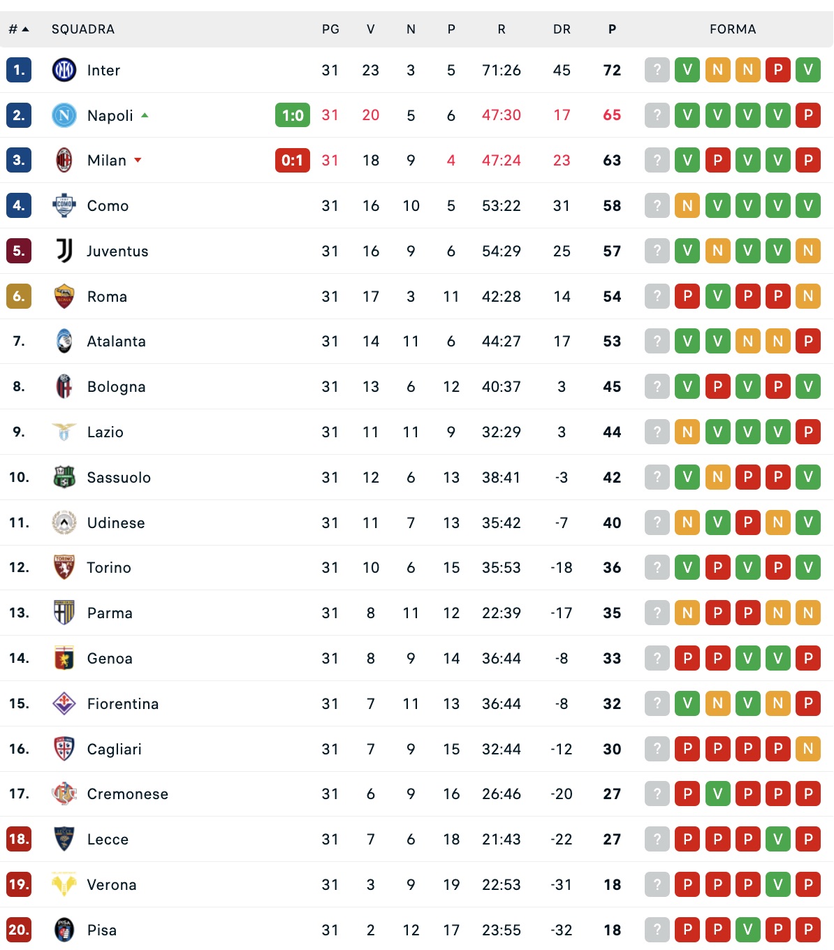 Di seguito la classifica di Serie A aggiornata dopo la 31ª giornata: