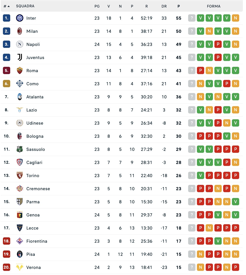 Serie A, la classifica: il Napoli si prende i tre punti e consolida il 3° posto
