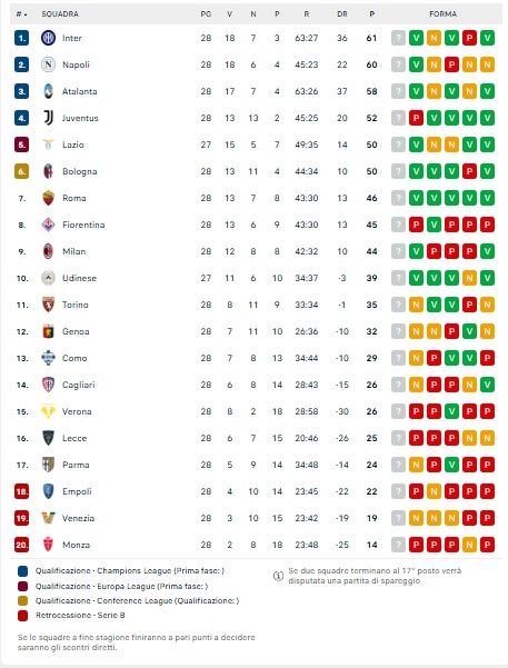 Serie A, la classifica: l’Atalanta a -3 dall’Inter e domenica c’è lo scontro diretto!