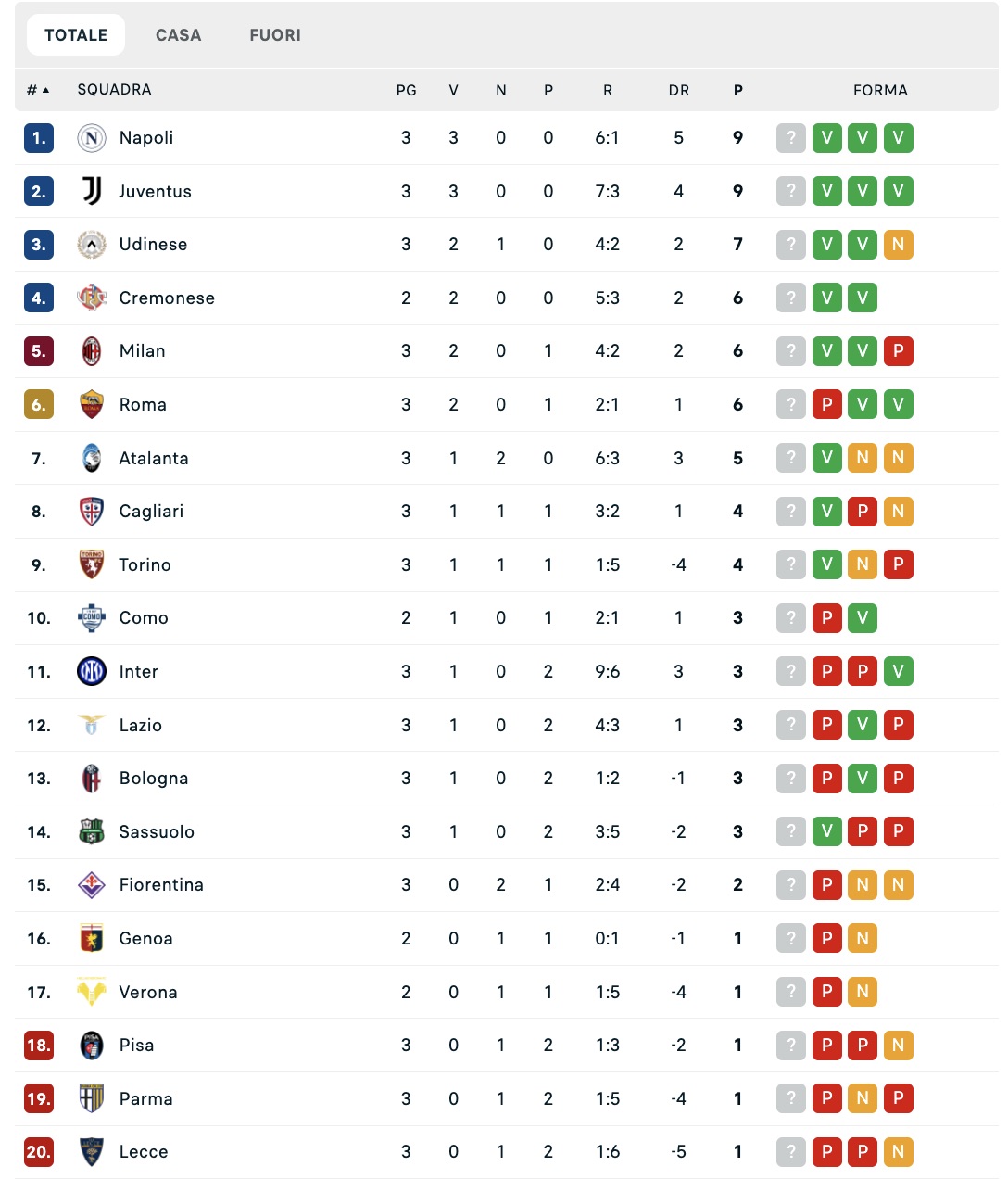 Il Milan batte di misura il Bologna e mette in fila la seconda vittoria, portandosi a quota sei punti in classifica: i rossoneri - così come la Roma - sono a meno tre punti dalle capoliste Napoli e Juventus a quota 9. Occhio anche all'Udinese, con 7 punti, e alla sorpresa Cremonese che in caso di vittoria nel posticipo del lunedì salirebbe a punteggio pieno. Più lontana l'Inter per il momento, che dopo due ko è già costretta ad inseguire