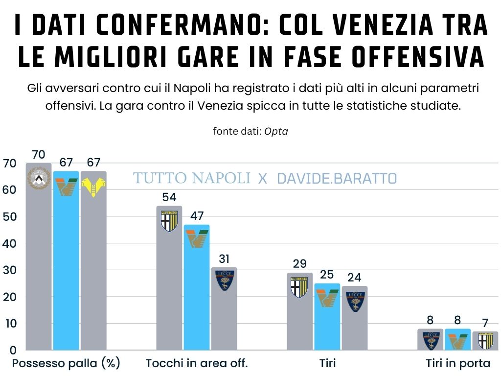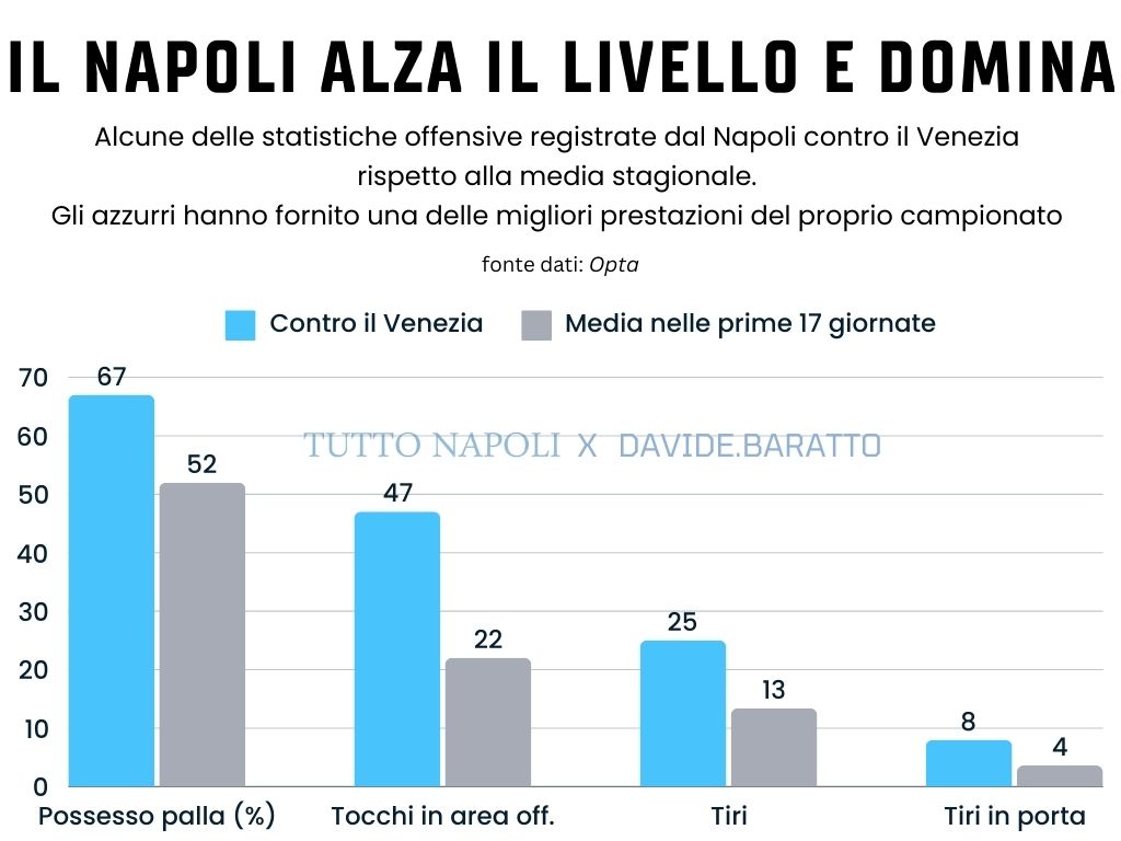 Una prestazione che conferma il trend di crescita in fase offensiva iniziato contro Torino e Roma, che ha avuto un piccolo stop con la Lazio, ed è poi ripreso contro Udinese e Genoa fino ad arrivare a ieri. I numeri infatti certificano quella contro il Venezia come una delle migliori gare del campionato degli azzurri per il pericolo costante creato in avanti (vedi i due grafici riassuntivi a fine articolo). Sono stati ben 25 i tiri effettuati, quasi il doppio della media stagionale (13,5) e tra i match giocati in Serie A solo contro il Parma si era calciato di più (29 tiri in quell'occasione). Inoltre, delle 25 conclusioni ben 8 hanno centrato lo specchio della porta: mai in stagione il Napoli aveva tirato di più verso la porta avversaria. Rispetto alla media di 22 tocchi in area offensiva ogni 90 minuti, i 47 registrati invece coi lagunari raccontano che gli azzurri difficilmente sono così presenti negli ultimi 16 metri (solo contro il Parma si era fatto di meglio, 53 tocchi in area avversaria in quell'occasione, ma i ducali giocarono un tratto di gara in dieci uomini).